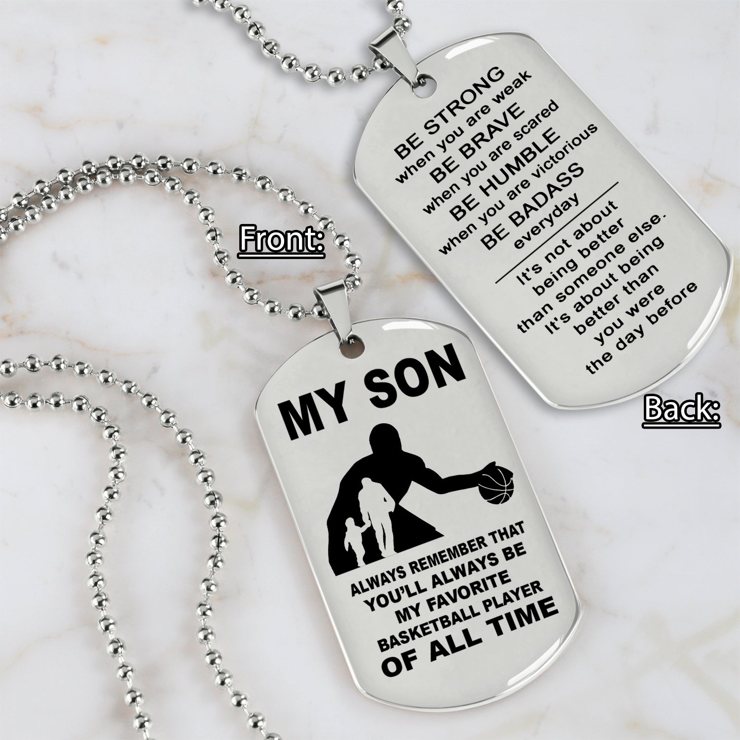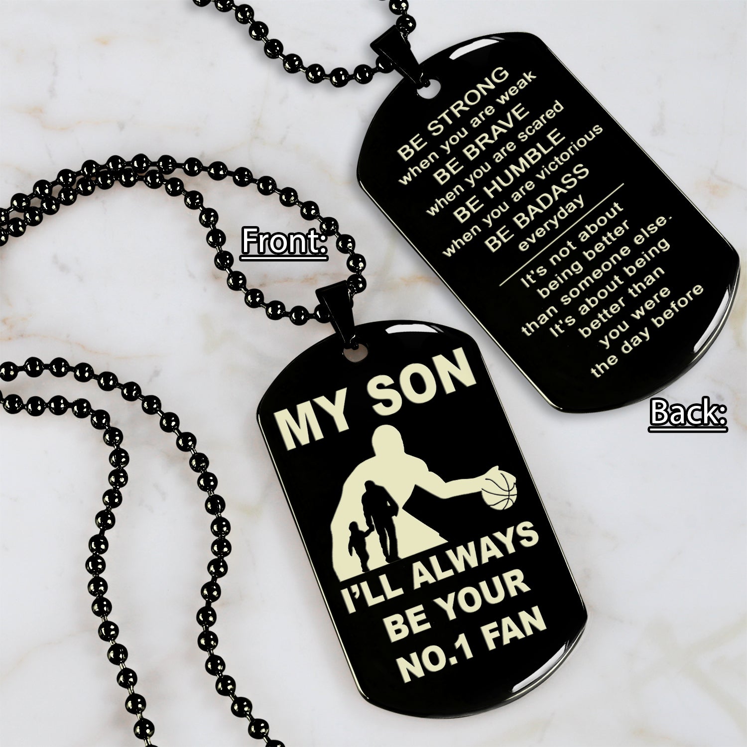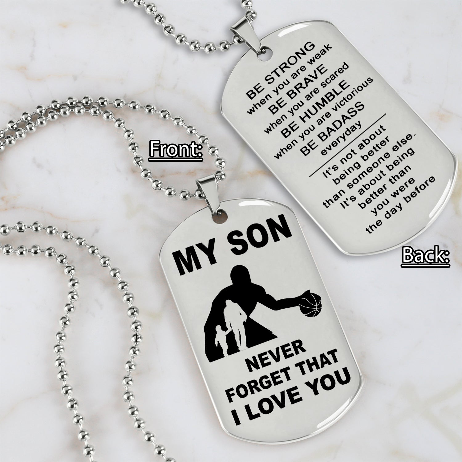 The dog tag contains a meaningful message that a father wants to share with his son. It is a perfect gift for birthdays, anniversaries, or any special occasion.