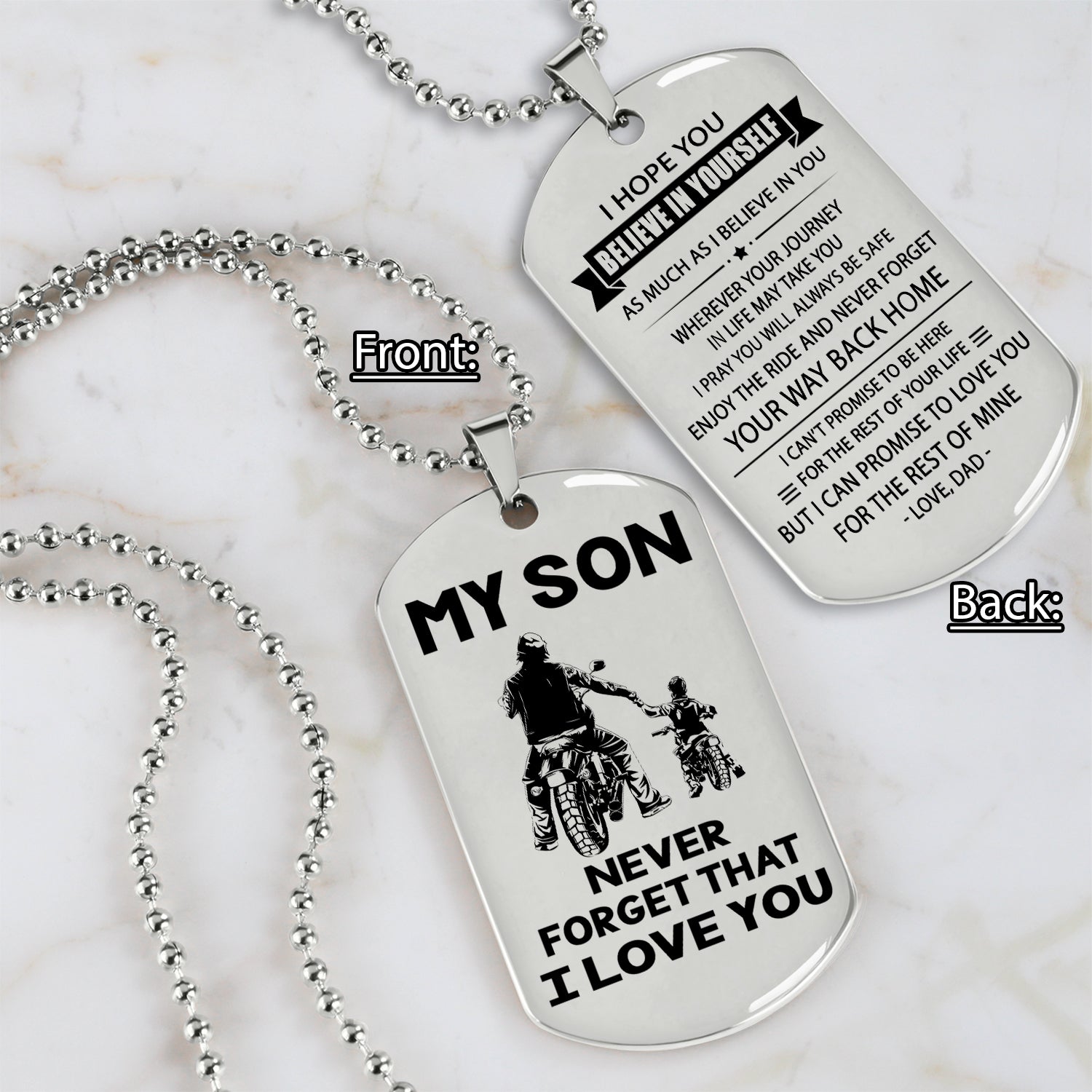 The dog tag contains a meaningful message that a father wants to share with his son. It is a perfect gift for birthdays, anniversaries, or any special occasion.