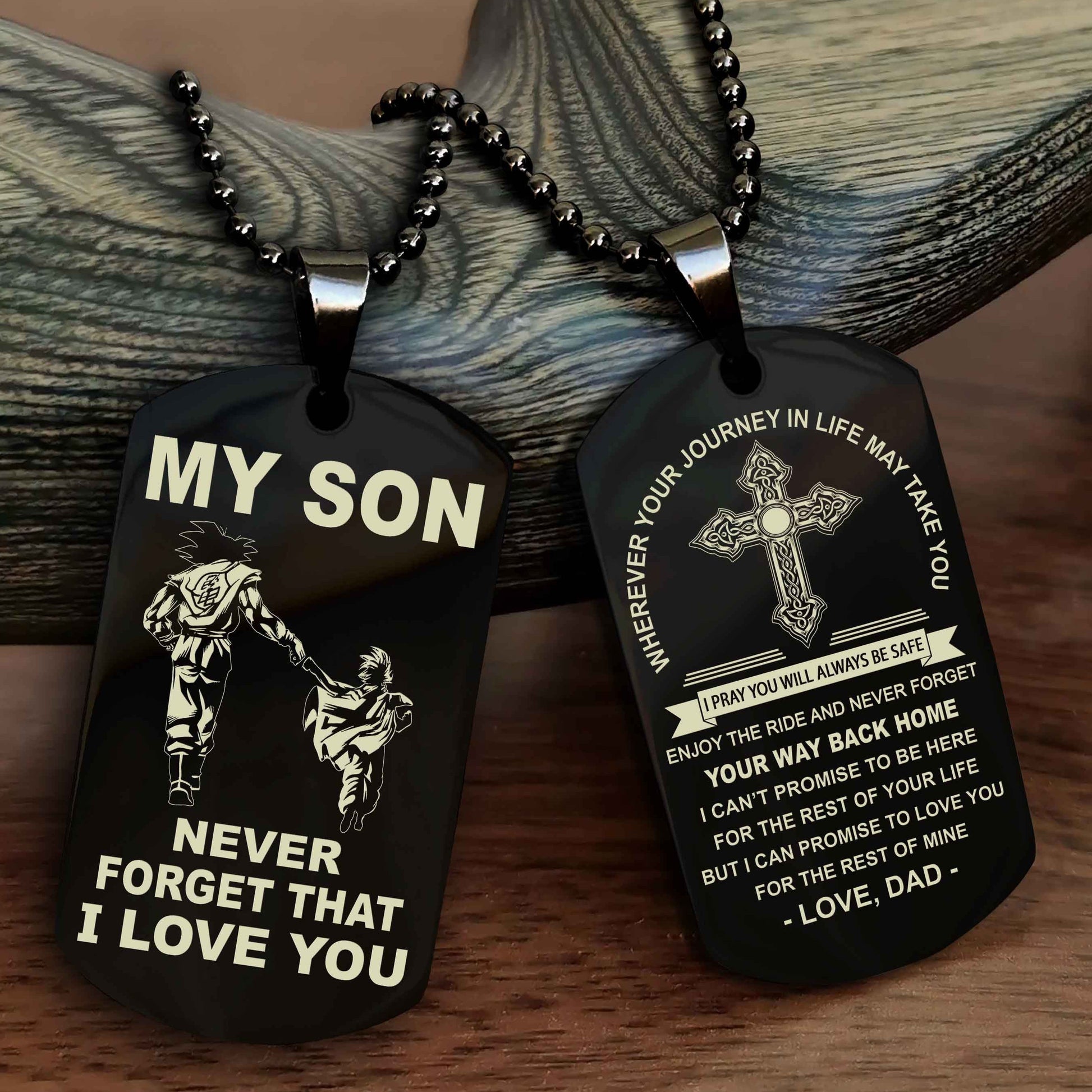 The dog tag contains a meaningful message that a father wants to share with his son. It is a perfect gift for birthdays, anniversaries, or any special occasion.